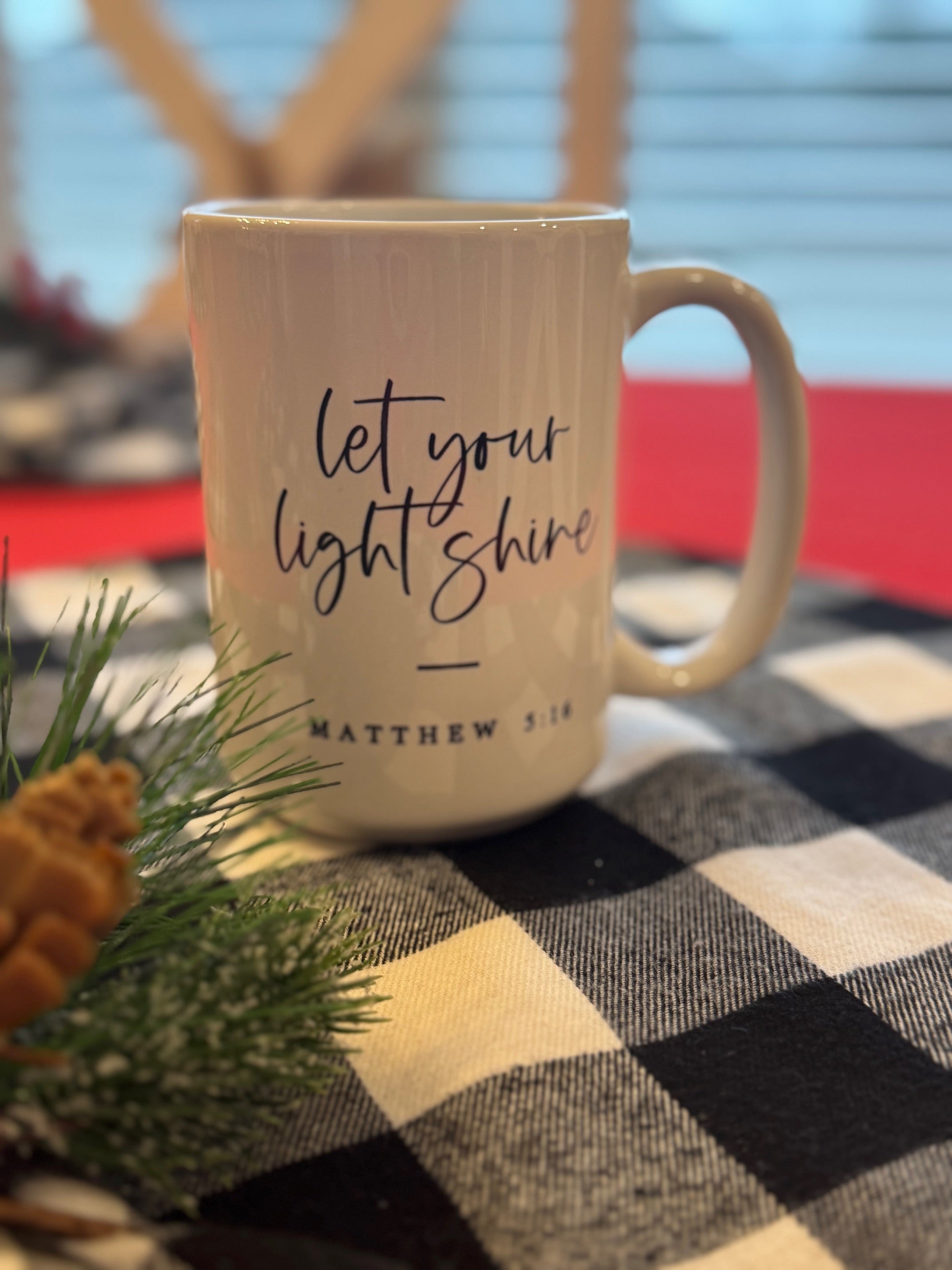 (Mug text: “Let Your Light Shine”)
